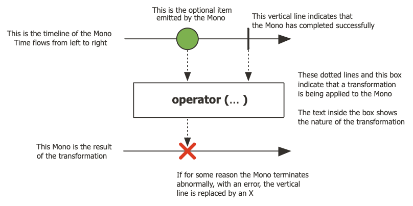 Mono 는 [0,1] 개의 항목에 대한 비동기 시퀀스를 나타내는 Publisher이다. Publisher는 Subscriber에게 데이터를 전달할 때는 onNext 시그널을, 데이터를 모두 전달했다고 알릴 때는 onComplete를, 에러를 전달할 때는 onError 시그널을 트리거하는데, Subscriber에서는 각각 onNext(), onComplete(), onError() 메서드로 전달된다. 즉, subscriber는 이 세 경우애 대한 핸들링 로직을 구현하면 된다.