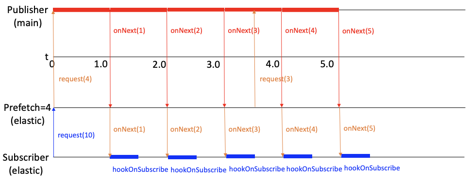 처음에는 prefetch만큼의 request를 호출하고, upstream은 다른 쓰레드에서 데이터를 prefetch 크기만큼 만들어 보내준다. publishOn은 upstream에서 prefetch의 75% 만큼의 onNext가 수행되면 알아서 request(prefetch * 0.75) 를 요청한다. 데이터를 받는 Subscriber 부분과 데이터를 만드는 Publisher 부분이 서로 다른 쓰레드에서 구동 중이라서 prefetch를 할 때 더 빨리 데이터를 받을 수 있다. (사실 내부적으로는 prefetch라기 보다 비동기 태스크라서 더 빨리 걸리는 것이라고 생각이 든다. 비동기가 중요한 것!)