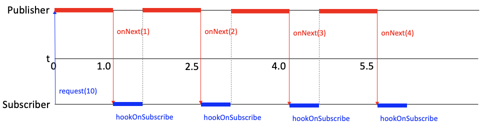 )위의 예제에서는 구독 시점에 하나의 데이터를 요청하고, 데이터를 푸쉬 받는 시점에 hookOnNext 메서드가 호출되어 데이터를 받으면 구독을 취소하도록 구현하였다.