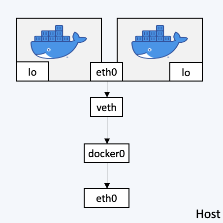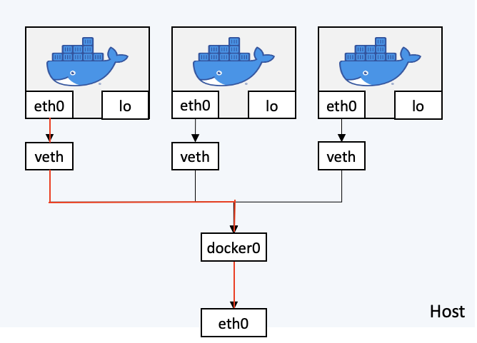컨테이너 내부의 eth0 인터페이스는 호스트의 veth... 인터페이스와 연결되어있다. 그리고 docker0 은 브릿지 네트워크이며, docker0 브릿지는 각 veth 인터페이스와 바인딩되어 호스트의 eth0 인터페이스와 이어주는 역할을 한다. 그래서 컨테이너 내의 eth0을 통해 호스트의 eth0과 연결될 수 있으며 외부와 통신 할 수 있다.