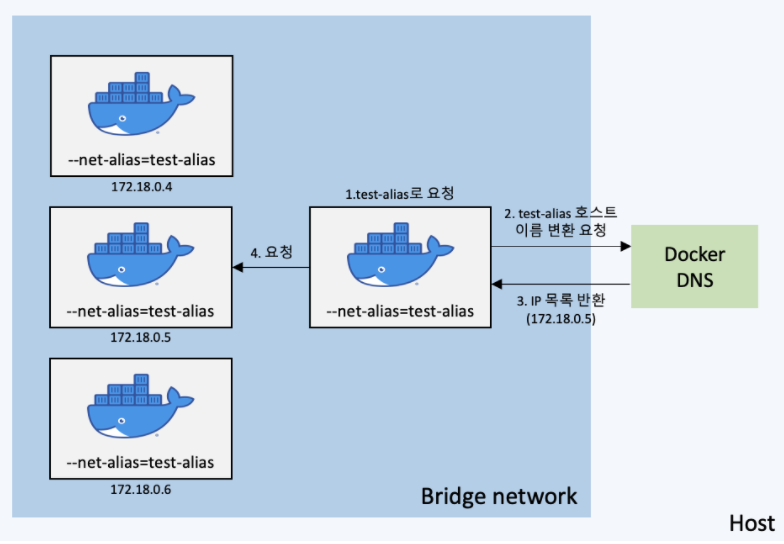 ping을 여러 번 날리면 매번 다른 주소로 날리는 것을 확인할 수 있다. 이는 무작위로 IP주소가 변경된다. 내부적으로 보면 도커 엔진에 내장된 DNS가 alias-test라는 호스트 이름을 --net-alias 옵션으로 alias-test 를 설정한 컨테이너로 변환해주기 때문이다. 그림으로 나타내면 다음과 같다.