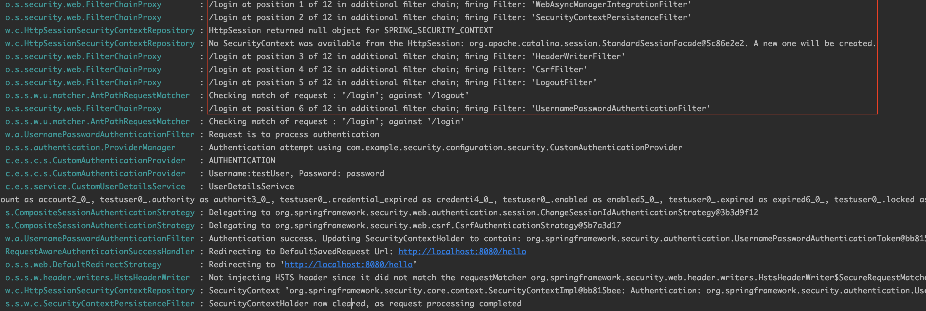 여기서, 로그인에 성공한 것 보단 로그에 초첨을 맞춰보자. 로그는 총 두 덩어리로 나뉠 수 있는데 로그인을 시도했을 때 생기는 로그와 /hello로 리다이렉팅 되었을 때 생기는 로그로 나뉜다.