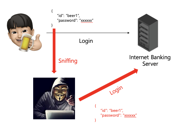 보안 연결 없이 사용자가 인터넷 뱅킹 애플리케이션에 로그인 한다면, 사용자가 입력한 로그인 정보는 plane text로 전달된다. 이 때 네트워크 트래픽을 스니핑하는 해커가 있다면, 해커는 쉽게 사용자 credential(ID / Password)을 탈취할 수 있어 해킹할 수 있다. 따라서 이 방식은 안전하지 않다. (네트워크는 정글이다..)