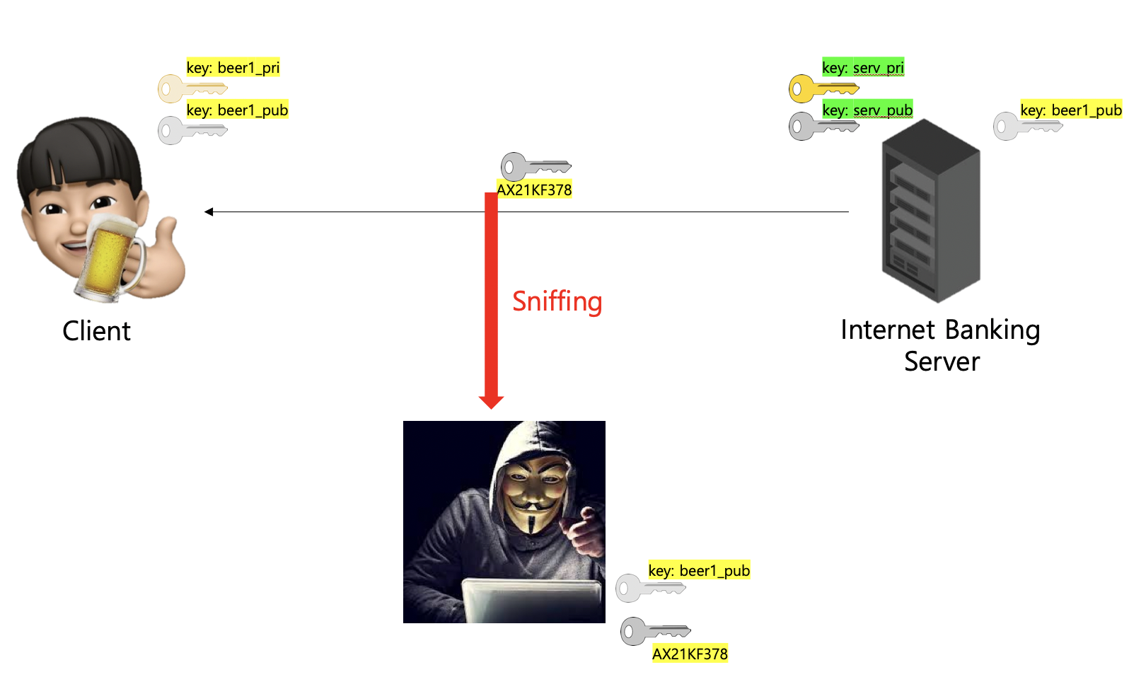 Asymmetric Encryption은 스니핑으로부터 안전하다. 서버와 클라이언트 간 key를 공유하는 과정만 보면 알 수 있듯이 해커가 스니핑으로 얻을 수 있는 것은 클라이언트의 public key와 클라이언트의 public key로 암호화된 서버의 public key 뿐이다.