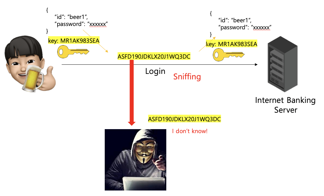 그러면 스니핑을 방지하고자 클라이언트와 서버는 특정 암 / 복호화 key를 사용하기로 약속한 후 보안통신을 할 수 있다. key가 없는 해커는 요청을 스니핑해도 암호문을 복호화 할 수 없기 때문에 소용이 없다!