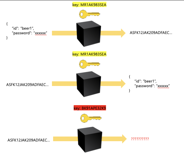 특정 key를 통해 문자열을 암호화하고, 복호화하는 어떤 암호화 방식이 있다고 하자. key는 기본적으로 임의의 숫자와 알파벳 조합이다. 특정 key를 사용하여 암호화된 데이터는 사람이 쉽게 알아볼 수 없는 문자로 변환된다. 그리고 암호화를 할 때 사용된 key만이 암호화된 문자를 복호화 할 수 있다. 다른 key를 사용하여 (제대로 된) 복호화는 불가능하다. 이러한 암호화 방식을 Symmetric Encryption 이라고 한다.