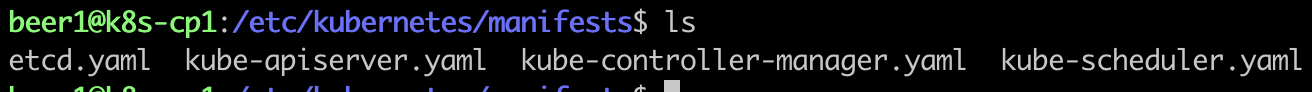 실제로 컨트롤플레인 노드애 접속하여 /etc/kubernetes/manifests 파일목록을 확인해보면 아래와 같다.