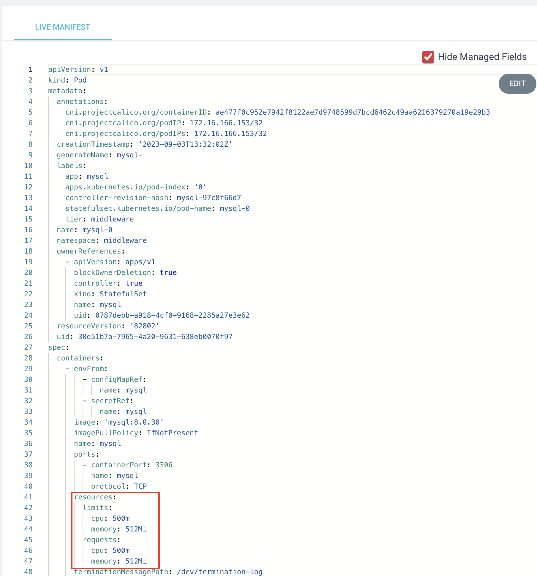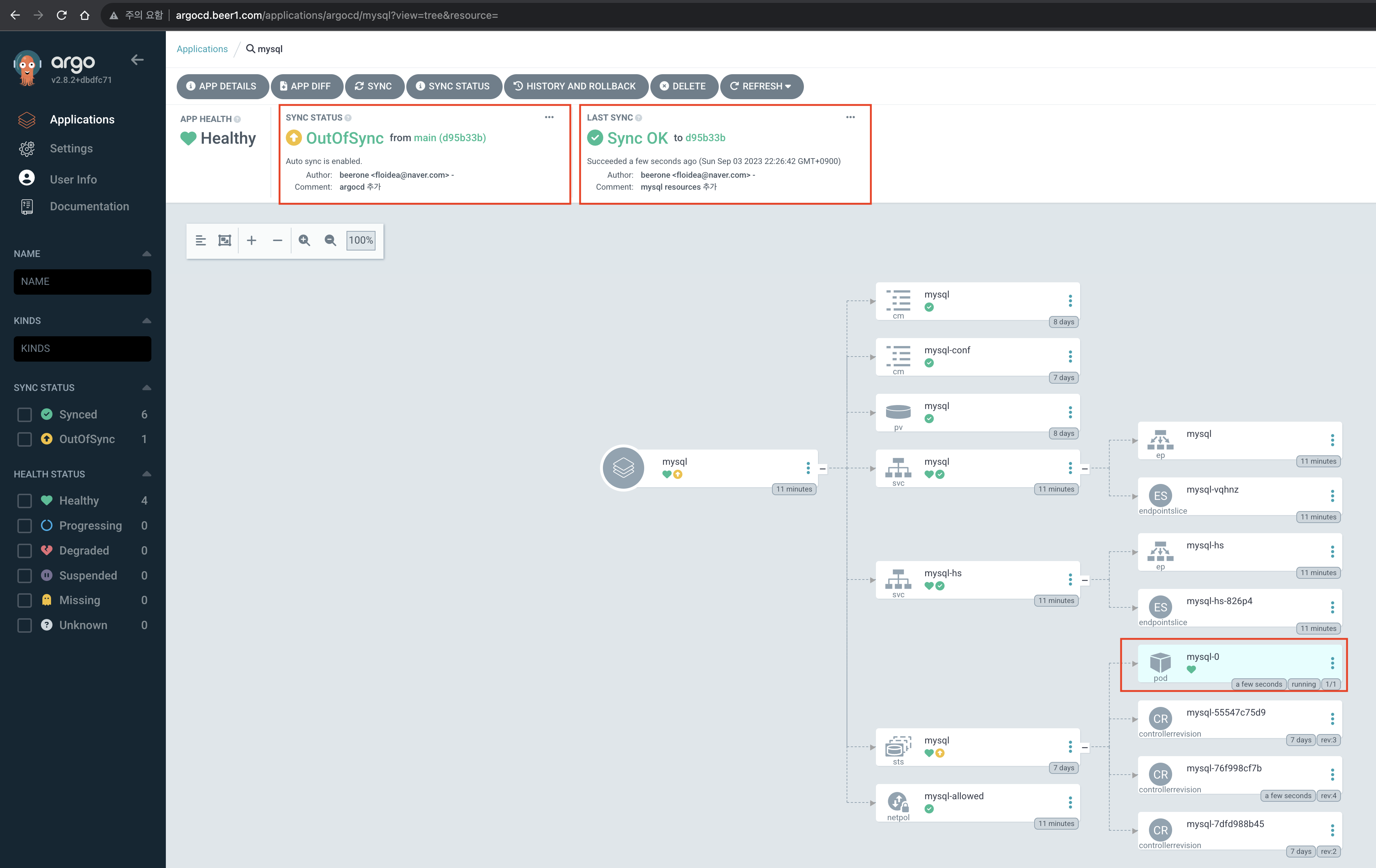 변경사항을 보면 LAST SYNC 창을 보면 git 커밋로그가 최신으로 업데이트 되었음을 알 수 있다. 그리고 mysql-0 파드가 새로 뜬 것을 확인할 수 있다. 그리고 StatefulSet의 현재 매니페스트 정보를 보면 추가한 resources 정보를 볼 수 있다.