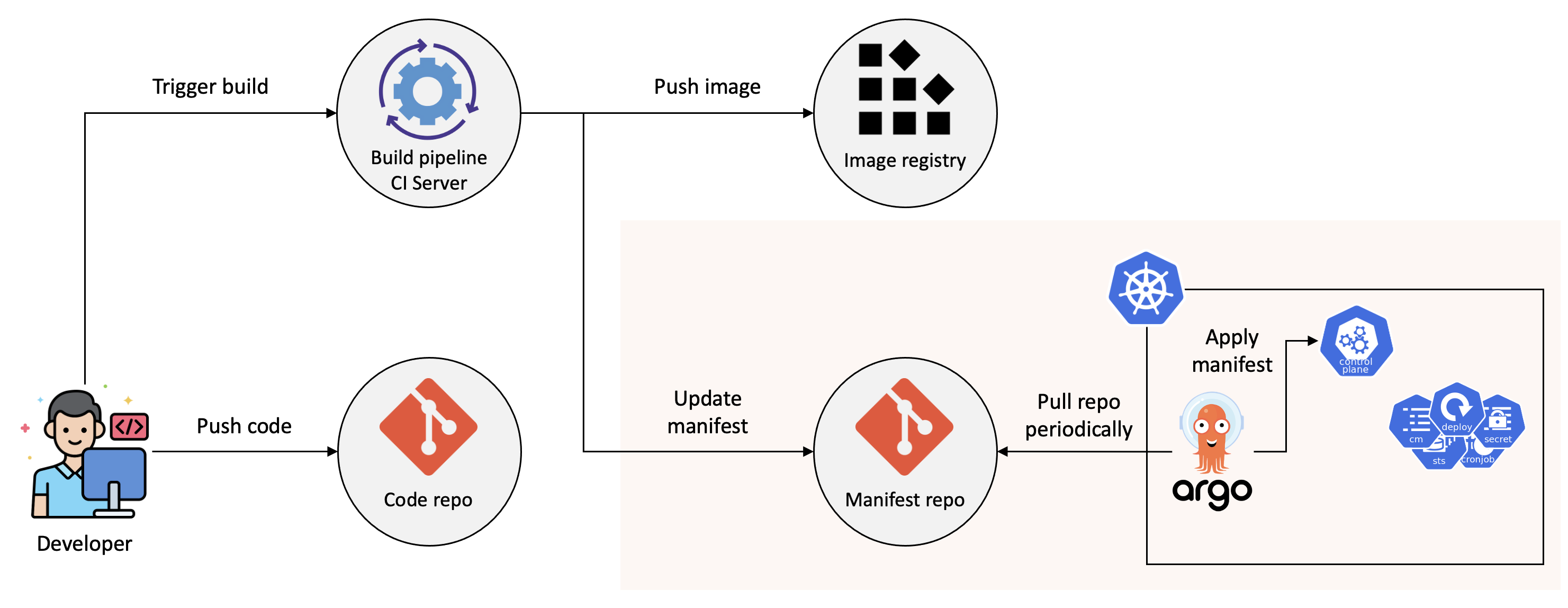 ArgoCD는 쿠버네티스에서 구동되는 대표적인 GitOps 기반의 CD(Continuous delivery) 도구이다. (GitOps에 대한 설명은 아래 포스트에서 정리를 했는데 개념이 생소하다면 참고자료로 봐주시면 감사하겠습니다.)