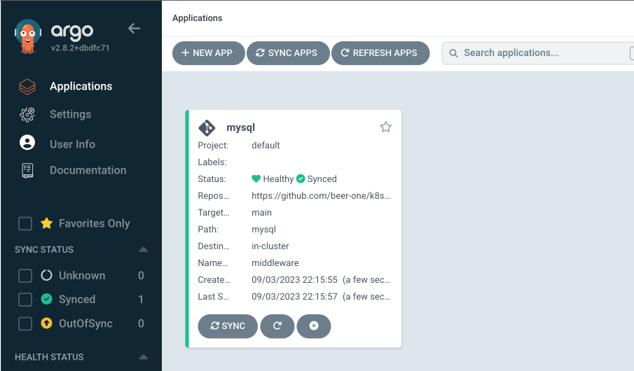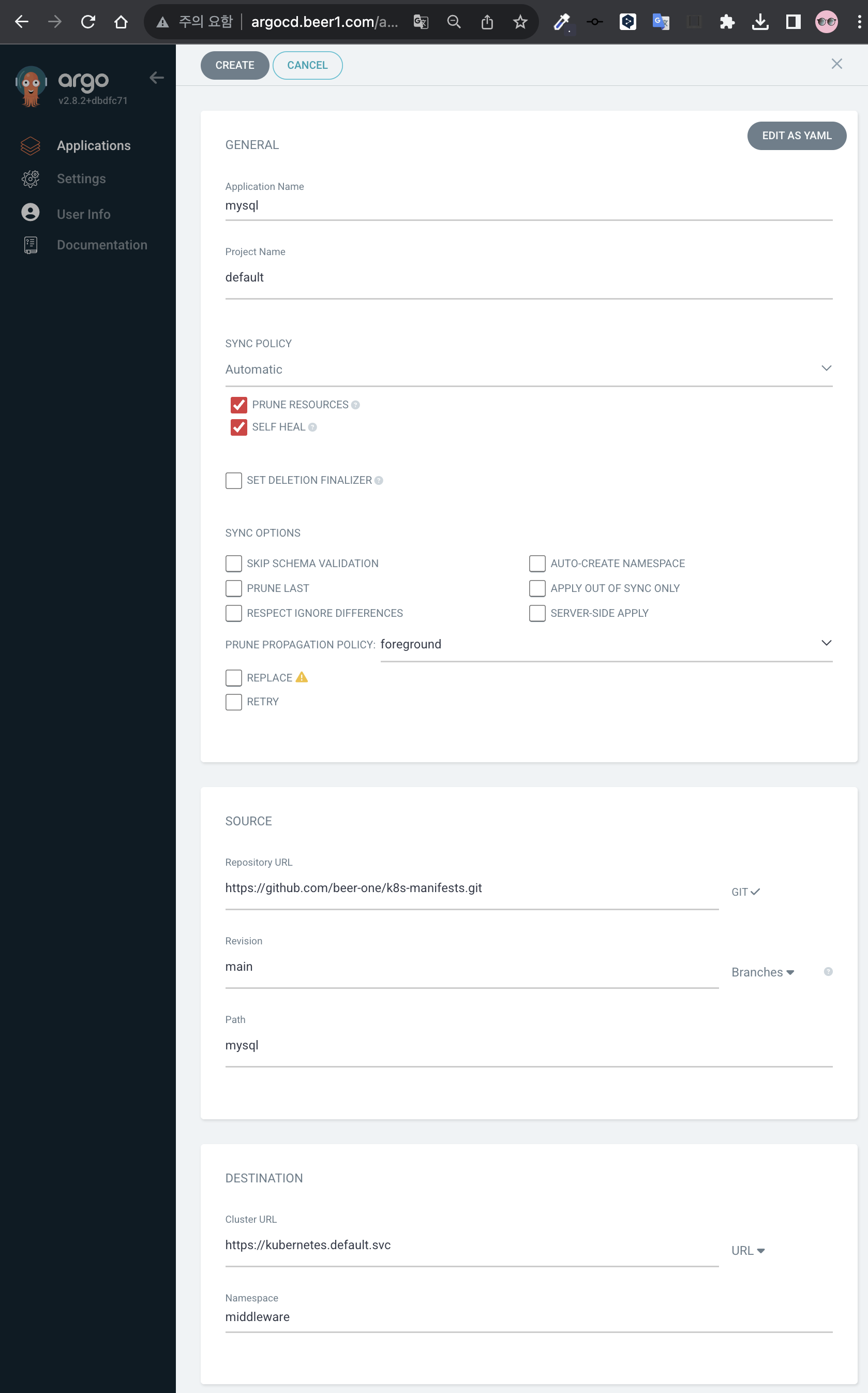 레포지토리를 등록했으니 이제 레포지토리에 저장된 mysql 매니페스트 파일을 연동해보겠다.