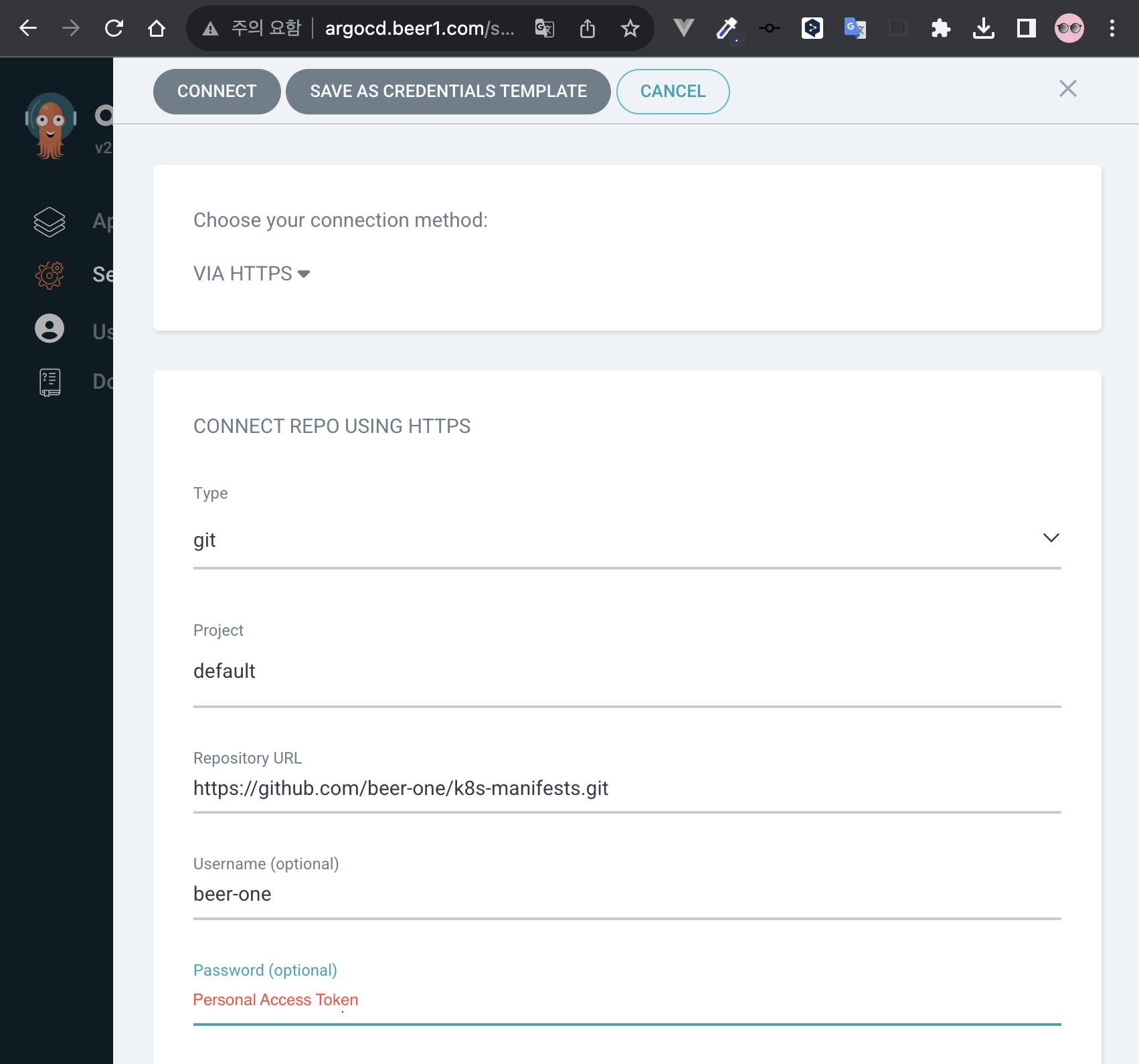 그리고 ArgoCD 웹 UI에 접속한 다음 Settings로 들어가면 Repositories 항목이 있다. 이 항목을 누르면 CONNECT REPO 라는 버튼이 있는데 이 버튼을 누르면 연동할 레포지토리 정보를 입력할 수 있다.'
