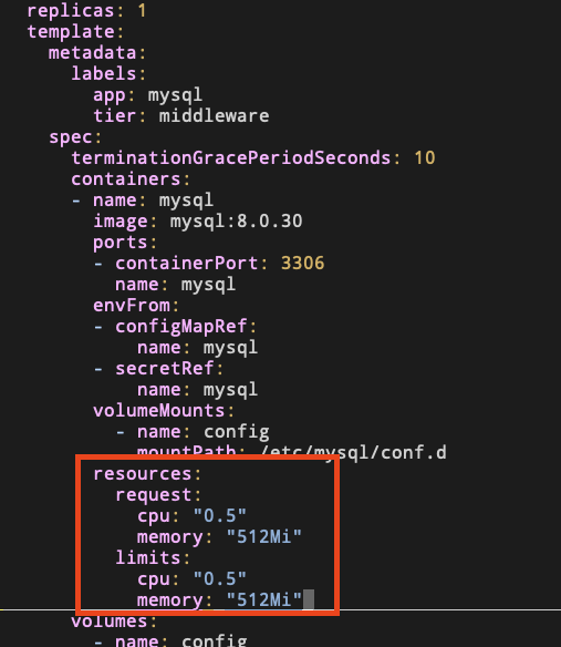 일단 Git에 저장된 mysql/statefulset.yaml 파일을 변경해보겠다. 원래는 resources 설정이 되어있지 않았는데 resources 설정을 추가하였다.