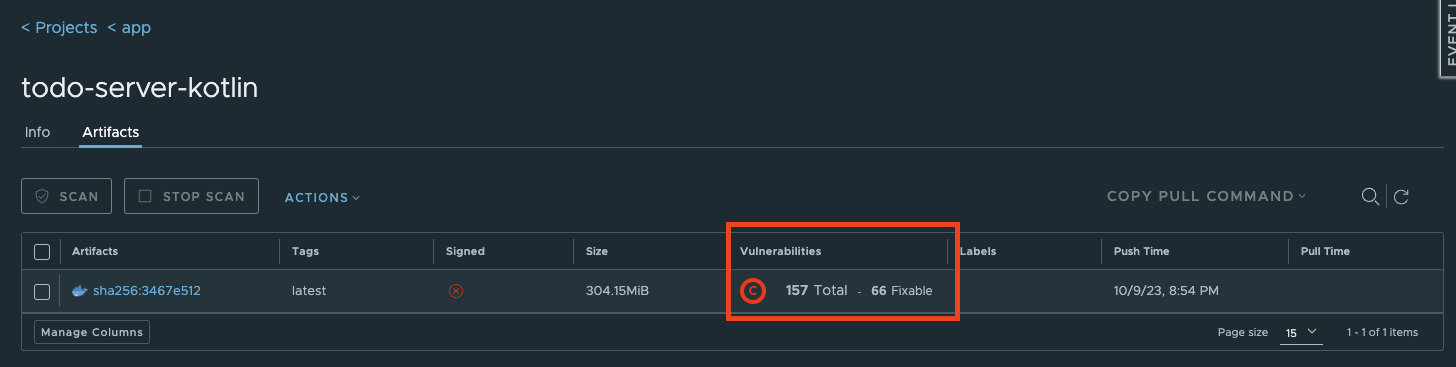 일단 프로젝트에서 이미지 이름을 클릭하면 Artifact 정보들이 나오는데, 여기서 취약점을 점검할 artifact를 선택한 다음 Scan 버튼을 누르기만 하면 간단히 취약점 점검을 할 수 있다.