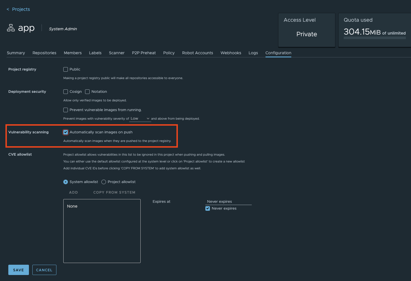 Harbor에는 Project별로 이미지 푸쉬 후 자동으로 취약점을 점검할 수 있는 설정을 할 수 있다. 아무 Project를 클릭하고 Configuration 탭을 클릭하면 프로젝트 설정을 할 수 있는데 여기서 Vulnerability scanning 에서 Automatically scan images on push 를 체크하면 해당 프로젝트에 푸쉬되는 모든 이미지는 푸쉬된 후 자동으로 취약점 점검을 할 수 있다.