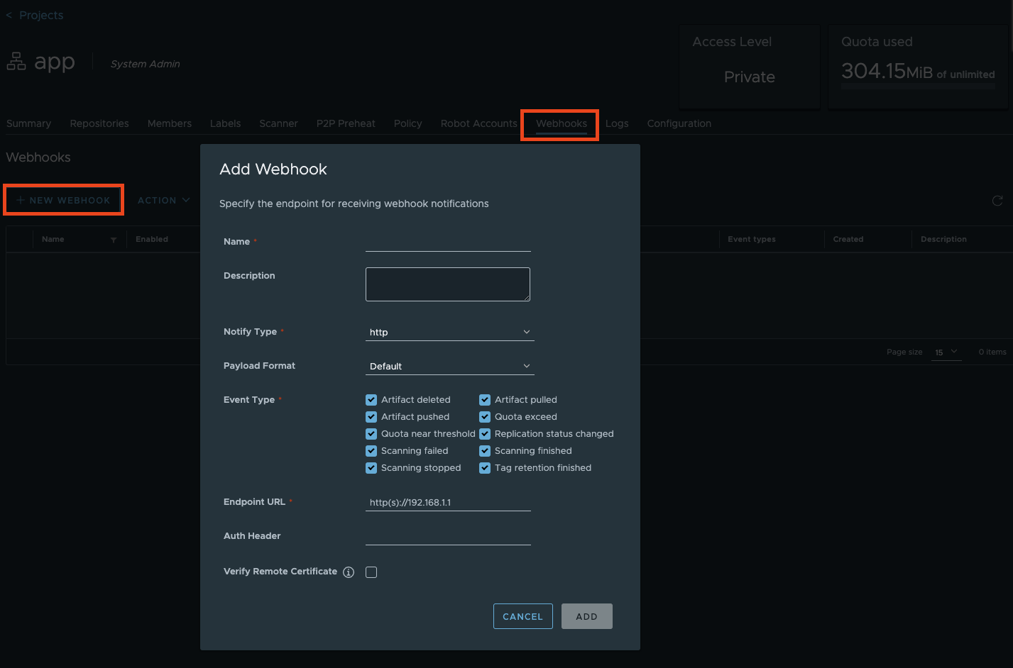 그리고 Webhook 탭을 클릭하면 여러 웹훅을 설정할 수 있는데 NEW WEBHOOK 버튼을 누르면 특정 이벤트가 발생했을 때 웹훅을 날릴 수 있도록 구성을 할 수 있다. 웹훅을 잘 사용한다면 다양한 자동화 및 알림 기능을 사용할 수 있다. 예를 들어, Scanning finished 이벤트 타입의 웹훅을 설정한다면 스캐닝이 완료된 후 Slack 등으로 알림을 보내는 기능을 도입할 수 있다.