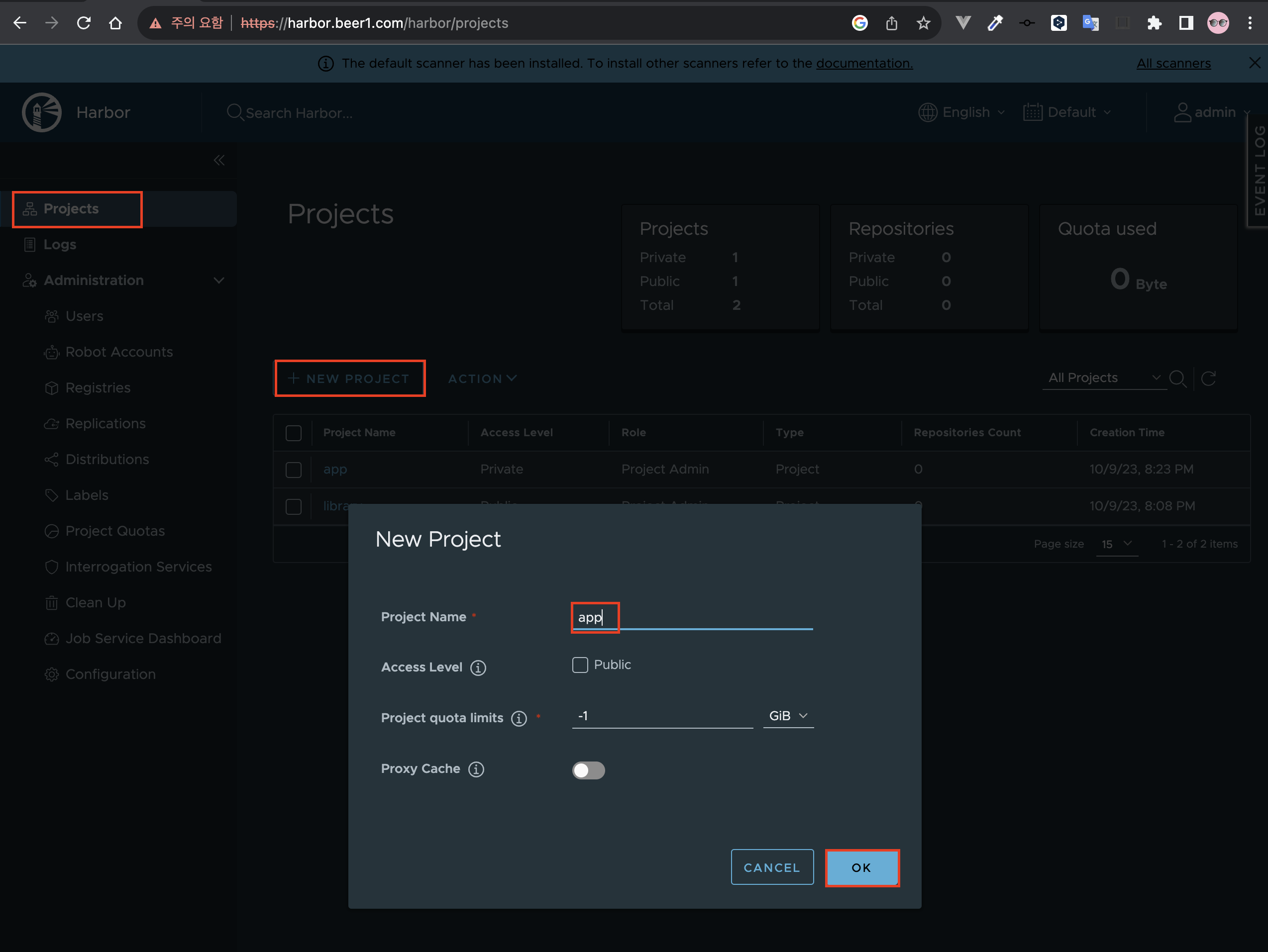 하버 로그인에 성공하면 프로젝트가 보일 것이다. 하버에서는 프로젝트 단위로 이미지를 관리하기 때문에 이미지를 저장하기 위해서는 프로젝트를 생성해야 한다. 이미지를 저장할 새 프로젝트를 하나 생성하자.
