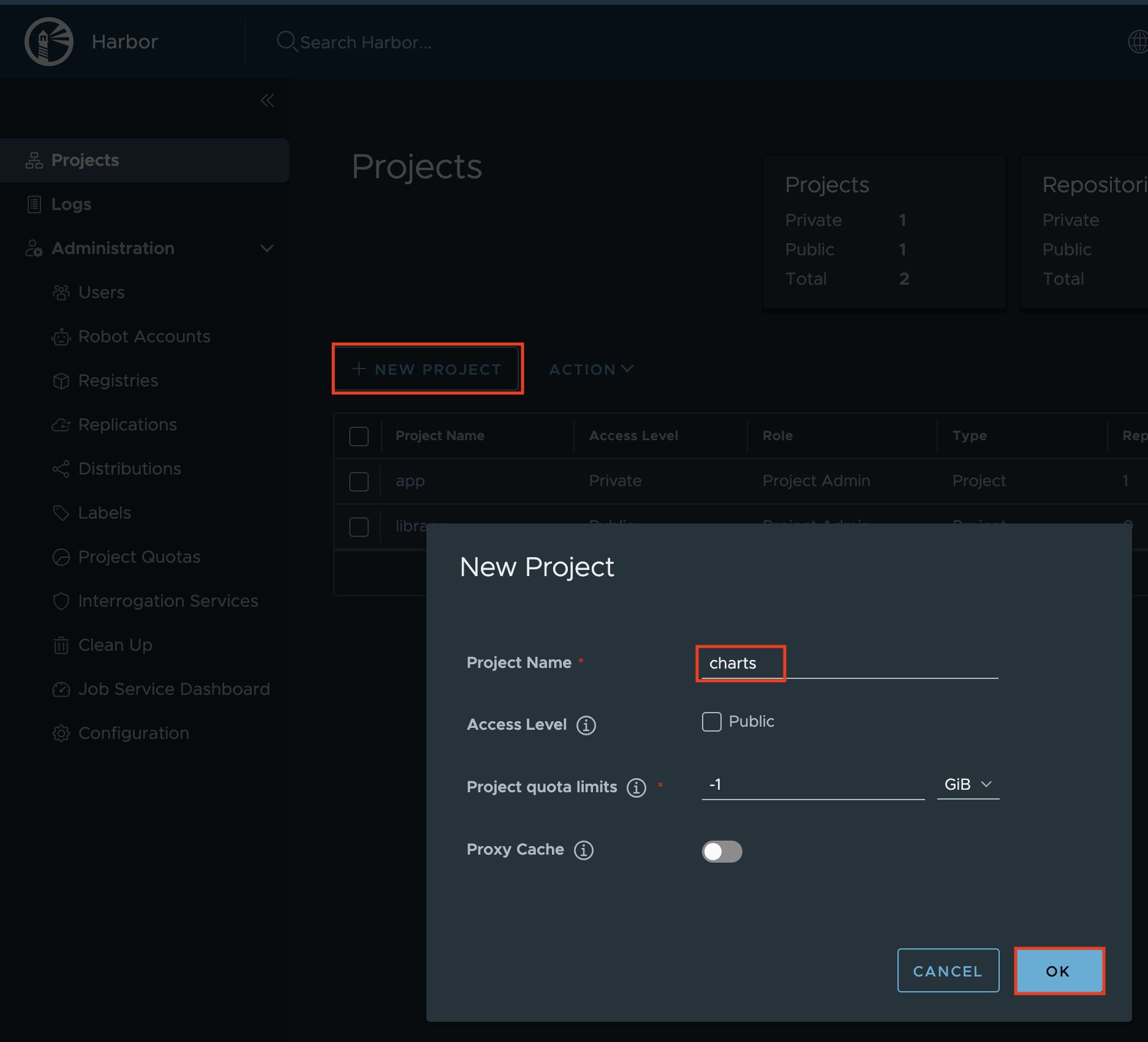 일단 Harbor에 접속한다음 차트를 저장하는 프로젝트를 하나 만들자. 사실 기존 프로젝트가 있다면 그냥 사용해도 무방하다. 하지만 컨테이너 이미지를 저장하는 프로젝트와 분리되면 더 보기 좋을 것 같다.