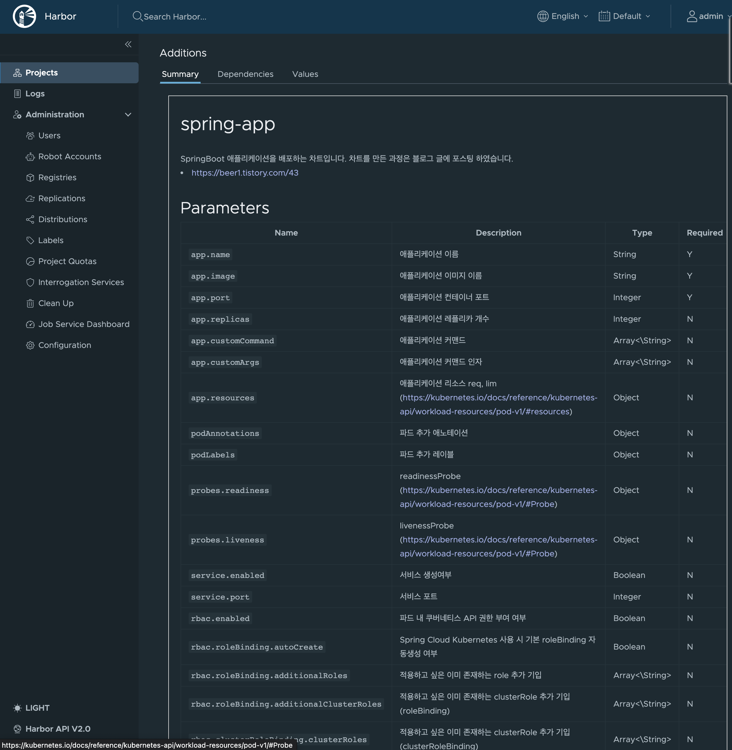 아티팩트를 클릭하면 차트에 대한 메타데이터와 README.md를 볼 수 있다. README.md 문서화를 잘 하면 다른 사용자가 차트를 이해하는 데 도움이 될 것이라 생각한다.