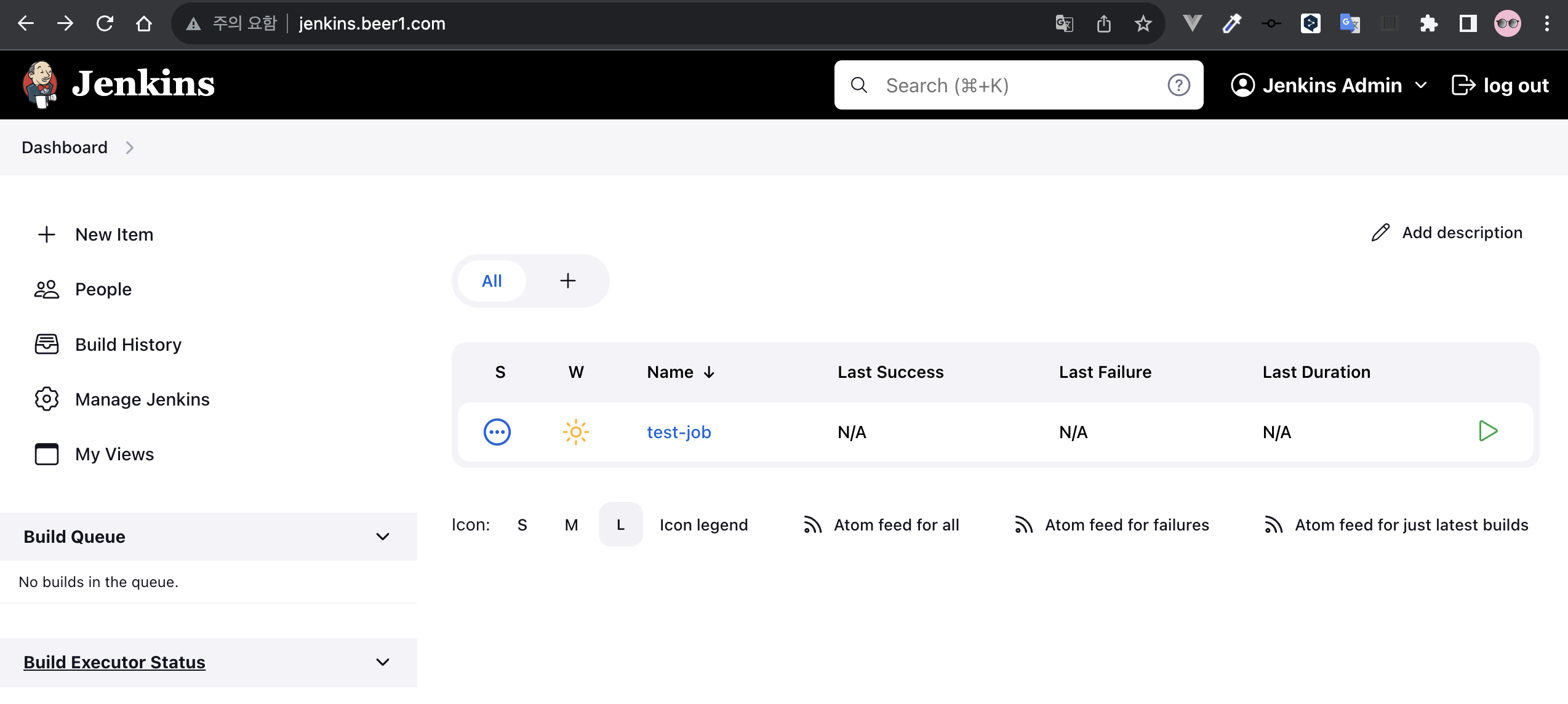 Ingress에 설정한 호스트로 Jenkins에 접근을 하면 로그인 창이 뜨는데 기본적으로는 계정은 admin이고 비밀번호는 시크릿에 저장된 것을 사용하면 된다.