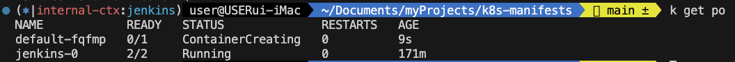 - Job 실행은 최초에는 jenkins-0 (Jenkins Controller)에서 실행하고 Controller에서 Agent Pod를 실행시킨다.