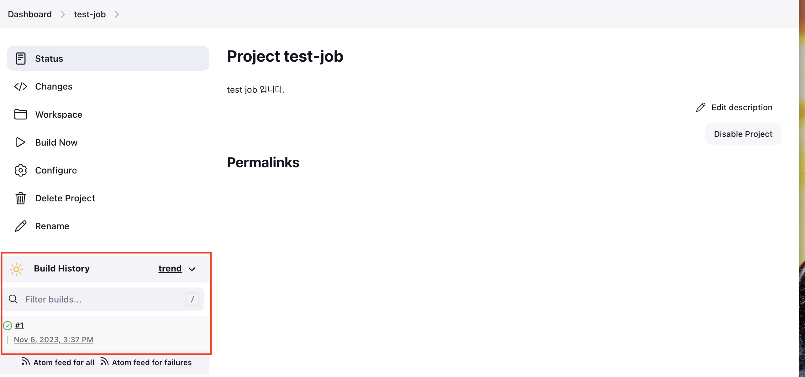 Job이 실행되면 아래 화면과 같이 #1번 빌드가 히스토리에 쌓인다. 실행 중일 때는 #1은 파란색, 실행 완료되고 정상 종료되는 경우 화면과 같이 초록색으로 표시된다.
