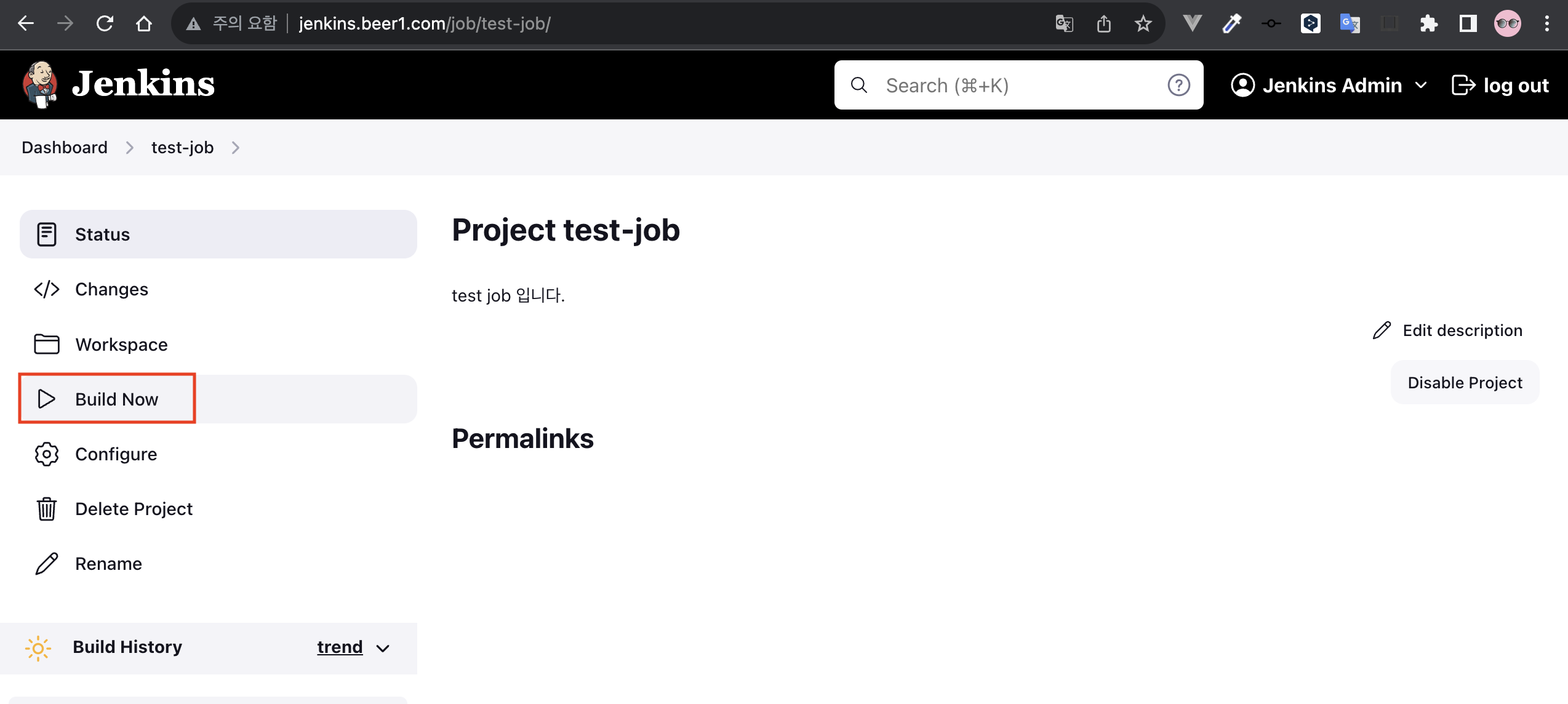 일단 생성된 Job의 이름을 클릭하면 Job의 상태를 보거나 설정을 보거나 실행할 수 있는 화면이 뜬다. 여기서 Build Now를 클릭하면 Job이 실행된다.