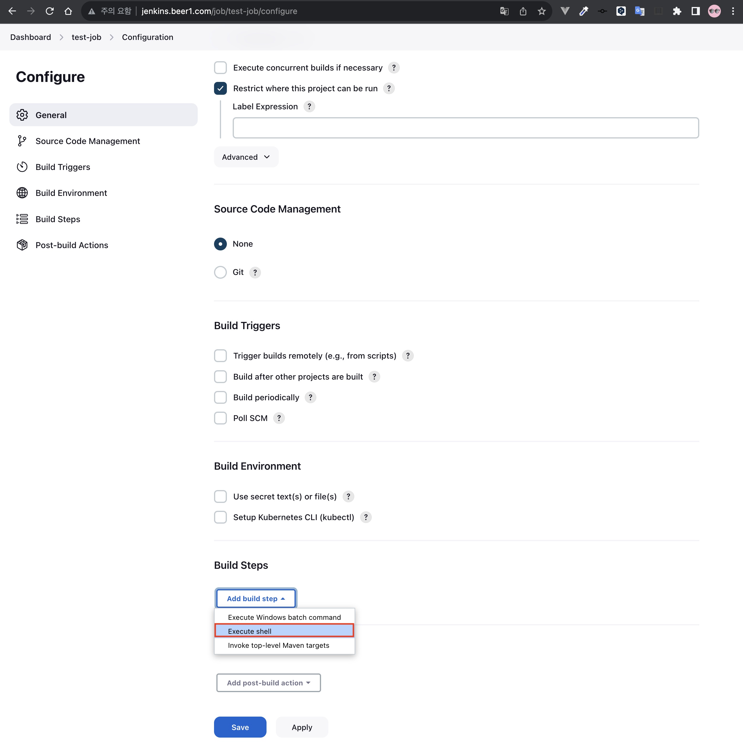 - 잡에 쉘 스크립트를 작성하기 위해서는 Build Steps를 Execute shell으로 선택하면 쉘 스크립트를 입력하는 칸이 뜬다.