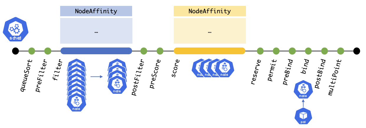 Node Affinity는 node label를 기반으로 파드를 스케줄링할 수 있는 노드를 제한할 수 있다. Affinity는 파드의 Spec이기 때문에 Affinity를 사용하면 파드가 노드를 선택하는 개념으로 볼 수 있다. Scheduler에서는 NodeAffinity 플러그인에서 NodeAffinity에 대한 필터링 및 스코어링 기능을 구현한다. Affinity에는 두 가지 유형이 있다.