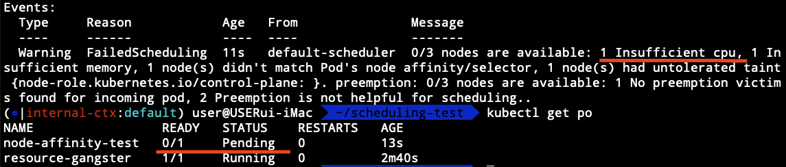 만약 cpu=fast 레이블이 있는 노드에 리소스가 없다면 어떻게 될까? 이전에 만들어둔 resource-gangster 파드를 생성한 후 node-affinity-test3을 생성해보자.