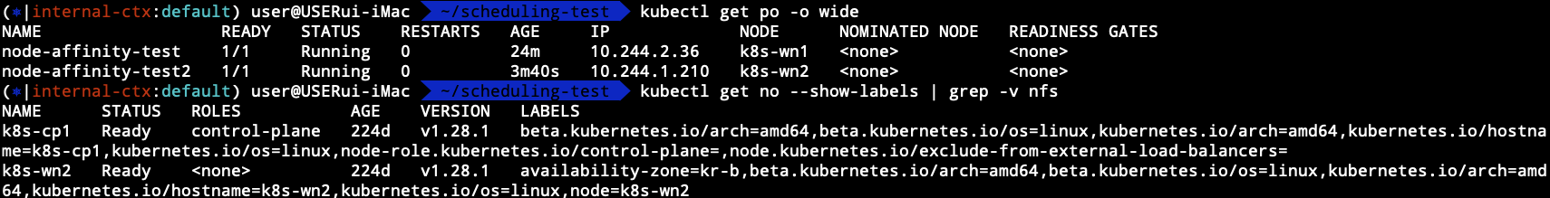 앞서 말했지만 preferredDuringSchedulingIgnoredDuringExecution은 어피니티의 조건을 만족시키는 노드에게 우선순위를 매기는 것일 뿐, 조건을 만족시키지 않는 노드를 배제하는 것이 아니기 때문에 어피니티의 조건을 만족시키는 노드에서 다른 이유로 스케줄링을 할 수 없는 경우에도 조건을 만족시키지 않는 노드로 스케줄링을 할 수 있다.