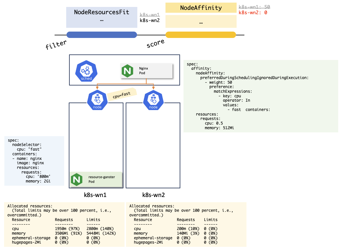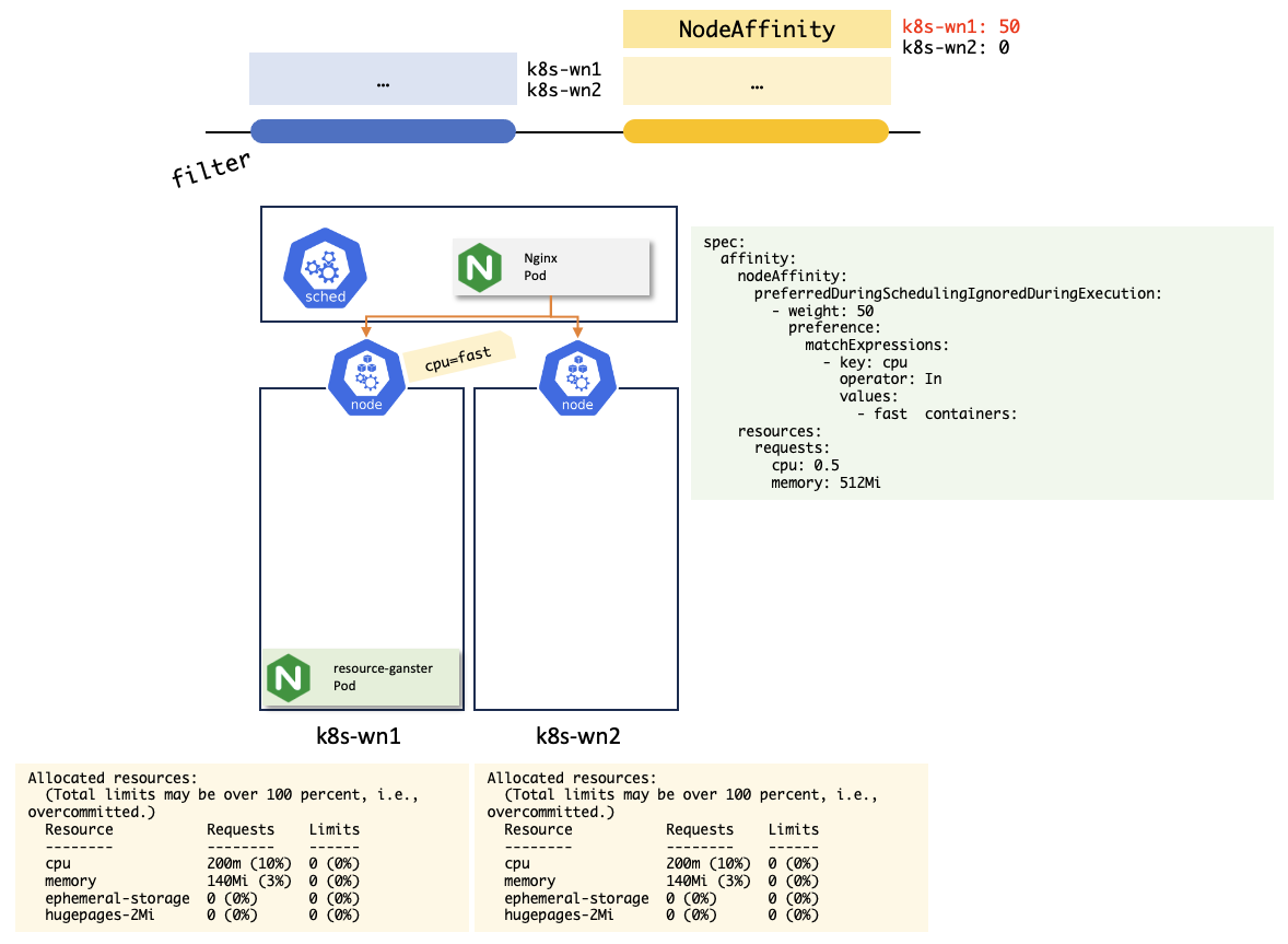 하지만 resource-gangster 파드가 k8s-wn1 노드에 스케줄링되어 k8s-wn1 노드에 가용 리소스가 없다면, 필터링 단계에서 k8s-wn1 노드가 제외되지만 k8s-wn2노드는 제외되지 않고, NodeAffinity에 의해 가중치를 받는 노드가 없기 때문에 가중치가 없어도 k8s-wn2노드로 파드가 스케줄링된다.