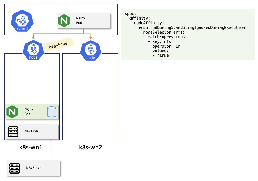 간단한 예시로, 파드를 nfs 레이블이 없는 노드에만 배치하고 싶을 때는 다음과 같이 지정하면 된다.