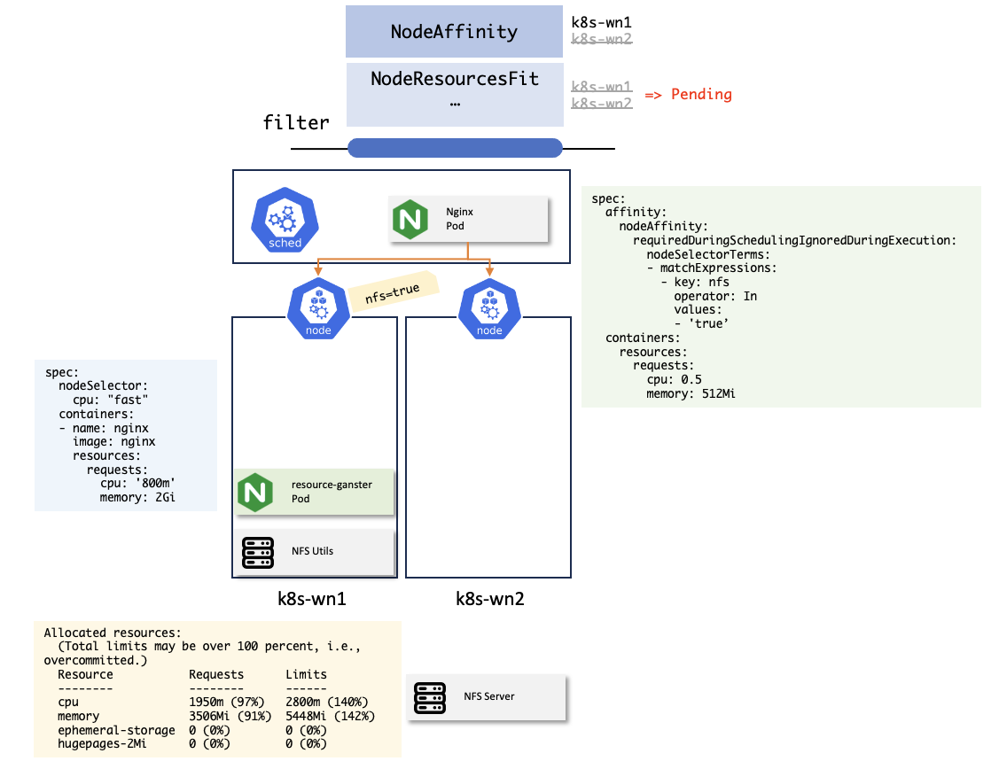 만약 nfs=true 인 노드에 파드에게 할당할 리소스가 부족하다면 어떻게 될까? 파드 스케줄링에서 필터링 단계 중, NodeResourcesFit이 있는데 이 단계에서는 파드에 정의된 resources.requests만큼의 리소스를 할당할 수 없는 노드는 파드 스케줄링 대상에서 제외시킨다.