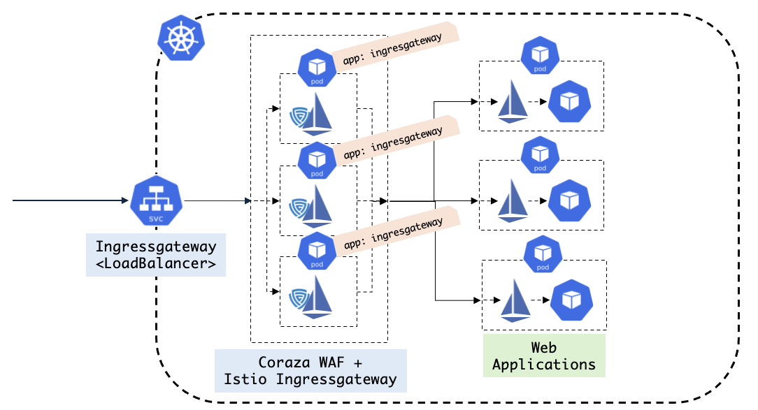 Coraza를 도입하면 그림과 같은 형태가 될 것인데, 들어오는 모든 요청들이 ingressgateway로 들어올 때 Coraza에서 요청을 검사한 후 부적절한 요청이 있으면 차단시키고 나머지 요청들은 ingressgateway에서 트래픽을 제어하여 적절한 하위 애플리케이션에게 요청을 전달하게 된다.