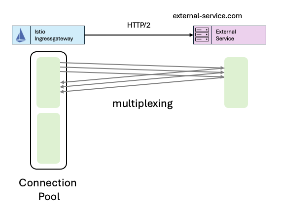 Istio ingressgateway의 본체인 Envoy proxy는 기본적으로 HTTP/2를 지원하며, 커넥션 풀을 가지고 있다. 기본적으로는 제한 없이 요청을 처리하는 데 필요한 만큼의 HTTP/2 커넥션풀을 생성한다.
