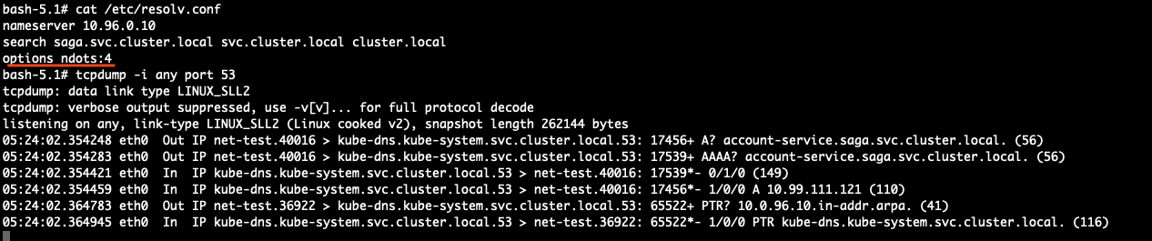 account-service.saga.svc.cluster.local도메인은 점이 4개이다 (<=4). 따라서 search 옵션이 적용되지 않고 바로 DNS 요청을 한다.