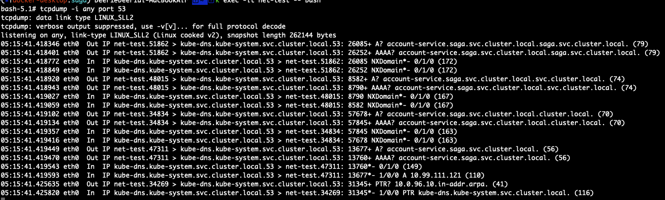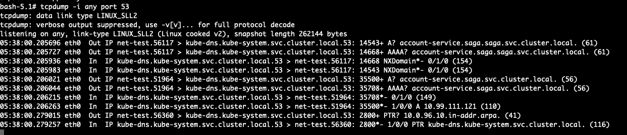 파드의 /etc/resolv.conf 에서 ndots:4로 옵션을 수정해보자. 그 후 account-service.saga.svc.cluster.local 으로 DNS를 요청하면 NXDOMAIN 에러가 발생하지 않는 것을 알 수 있다.
