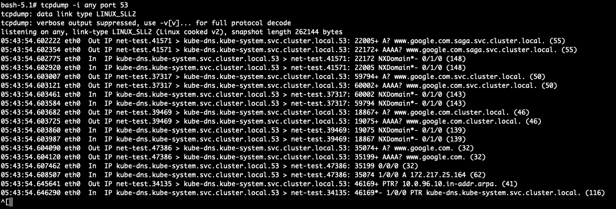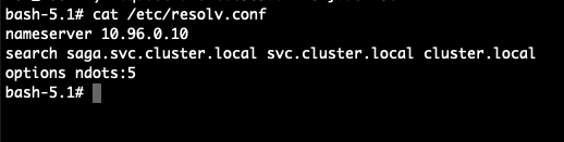 saga.svc.cluster.local을 도메인 뒤에 붙여서 질의를 한다. => 해당하는 도메인이 레코드에 없어서 NXDOMAIN 에러가 발생 - search 옵션에 의해