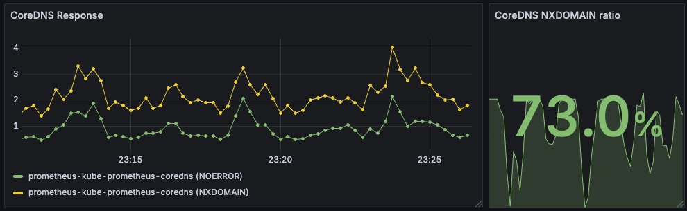 메트릭을 보면 NXDOMAIN이 75%정도이고, NOERROR가 25%정도 정도로 분포가 되어있는 것으로 확인이 되었다. 그런데 NXDOMAIN이 NOERROR에 비해 3배 더 많은데, 실제로 DNS 관련 에러는 엄청 간헐적으로 나왔었다. 실제로는 DNS 쿼리가 잘 되는데도 불구하고 NXDOMAIN이 왜 많이 나오는걸까?