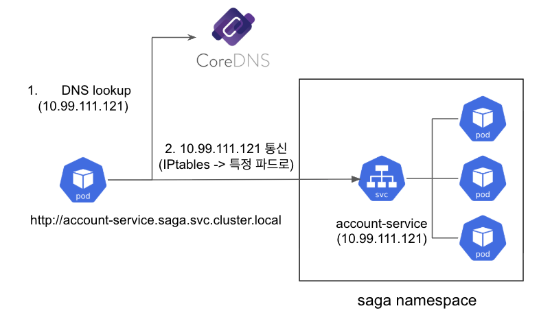 그리고 특정 파드에서 account-service.saga.svc.cluster.local 으로 통신이 가능한데, 서비스와 통신을 하기 전에 CoreDNS를 통해 DNS에 대한 ClusterIP를 획득한 다음 IP로 통신하게 된다.