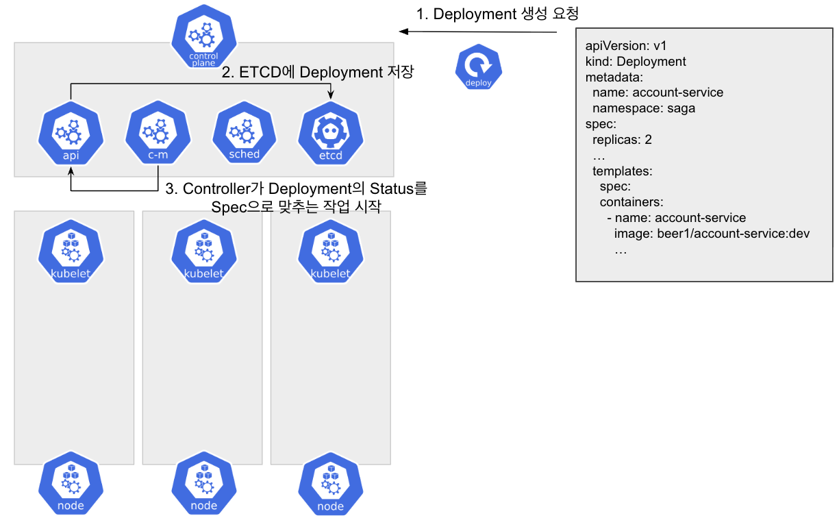 쿠버네티스에서 가장 간단한 배포 단위인 Deployment를 예를 들어보자. Deployment는 특정 스펙을 만족하는 파드를 여러개 (replicas) 배포함과 동시에 버전 관리 및 롤링배포 등을 지원한다. 사용자가 kubectl 등으로 Deployment를 생성하면 API Server가 요청을 받아서 ETCD에 Deployment를 저장한다.