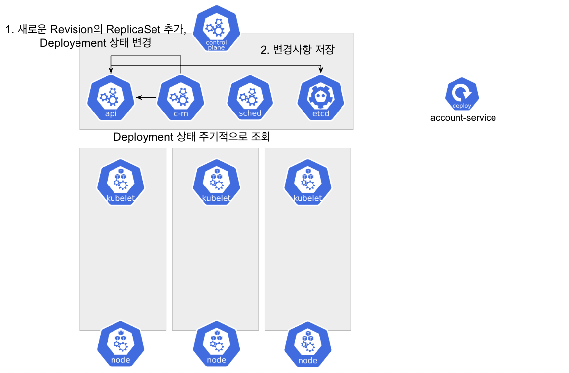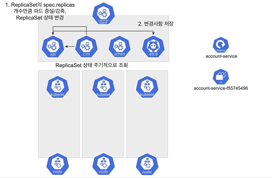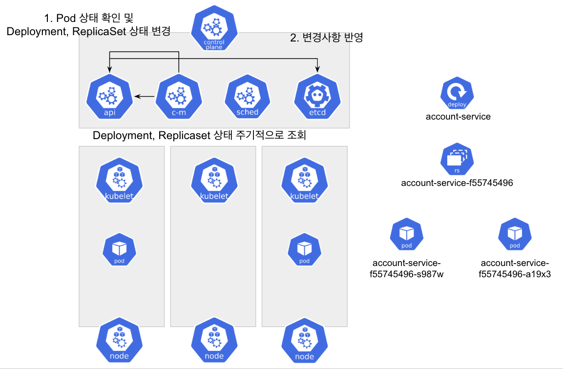 컨트롤러는 주기적으로 Deployment, ReplicaSet의 상태를 확인하여, Pod 상태를 확인한 뒤 현재 생성된 파드 및 준비된 파드 등의 상태를 변경한다.
