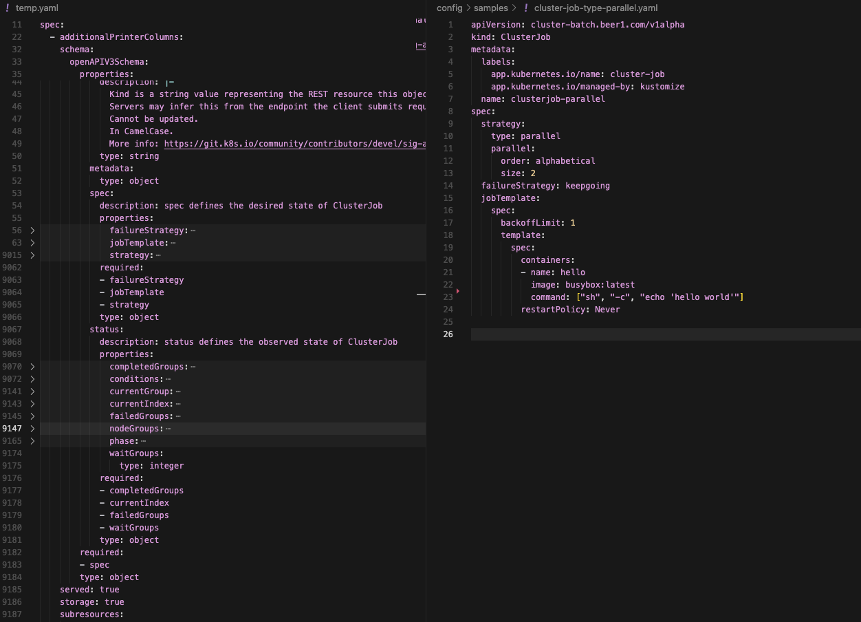 ClusterJob 커스텀 리소스를 만들면서 CRD가 길어진 이유가 있다. 일단 ClusterJob은 쿠버네티스의 Job 리소스를 활용한 확장 기능을 구현하기 위해 만들었다. ClusterJob의 spec 부분에서의 jobTemplate가 있는데, 이 값은 쿠버네티스의 CronJob에 있는 jobTemplateSpec 과 동일한 필드 구성이다.