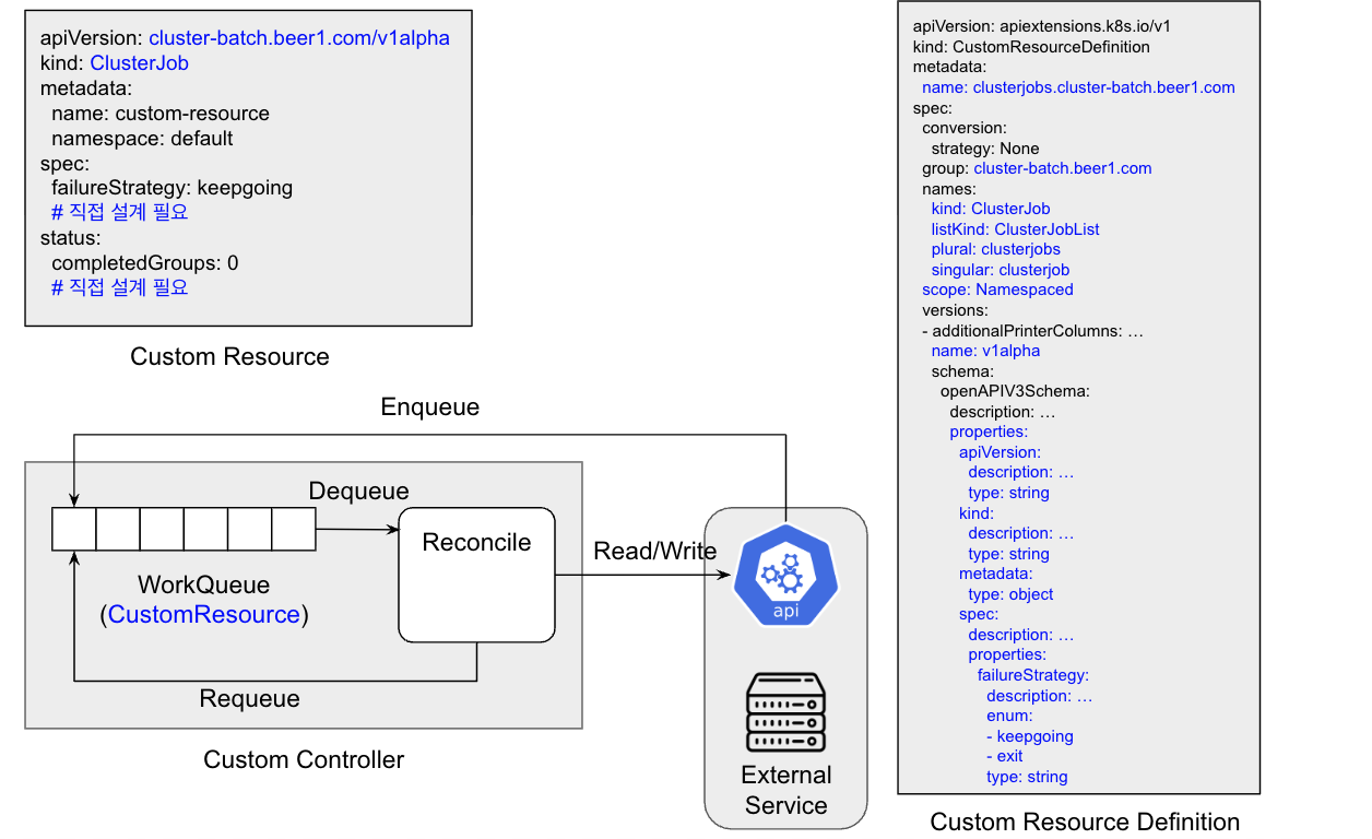이전 시간에는 kubebuilder를 사용하여 ClusterJob이라는 Custom Controller의 일부를 구현하였고, 실제로 쿠버네티스에 배포하여 동작을 확인하였다. 이번 시간에는 ClusterJob Custom Controller의 나머지 기능들
