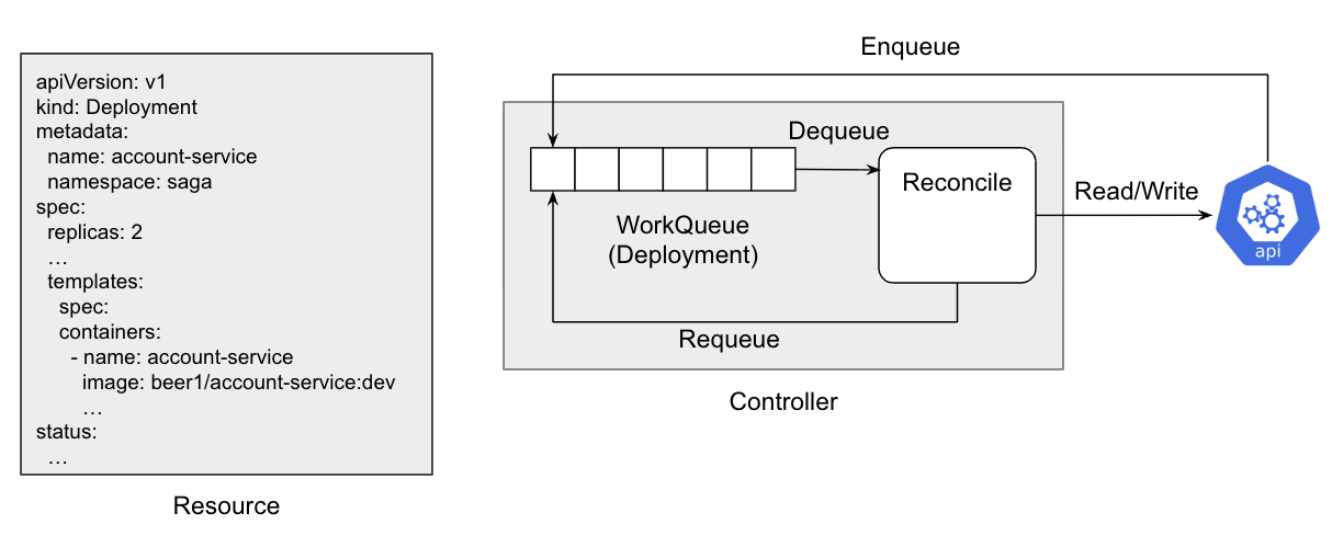 Controller는 해당 queue에 쌓인 오브젝트의 status를 spec으로 맞추는 작업을 진행한다. 이러한 작업을 reconcile이라고 한다. Controller는 status를 spec으로 맞추기 위한 작업을 수행한 후 변경된 오브젝트의 상태를 API Server를 통해 저장하고, 작업이 완료되지 않았다면 다시 WorkQueue에 적재한다.