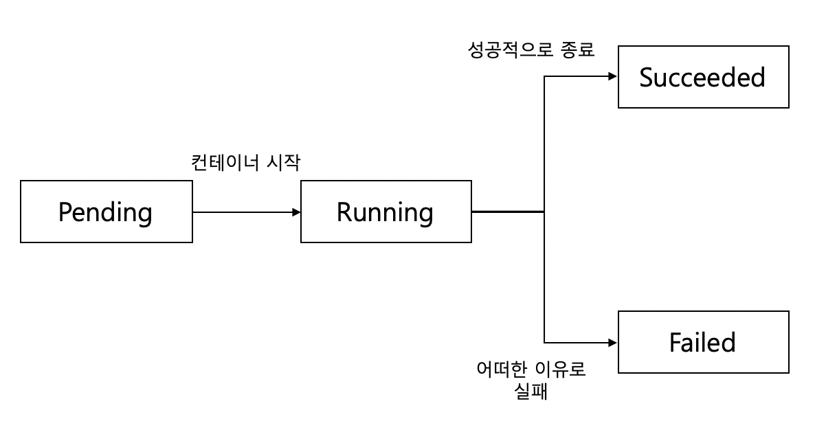 처음에 파드가 생성되면 Pending 단계에서 시작하는데, 이 때는 파드가 노드로 스케줄링 되지 않았거나 컨테이너를 생성하지 못한 단계이다. 만약 파드에 어떤 노드에 스케줄링되고 컨테이너가 하나 이상 생성되었다면 이 파드는 Running 단계로 된다. 그런 다음 파드의 컨테이너가 성공적으로 종료되었으면 Succeeded 상태가 되고 어떠한 이유로 컨테이너가 실패로 종료되었다면 Failed 상태가 된다.