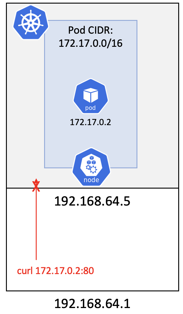 일단 파드가 잘 띄워졌으면 실제로 요청을 받는지 확인이 팔요하다. 하지만 파드의 IP는 쿠버네티스 클러스터에서 사용하는 내부 가상 IP이기 때문에 로컬 환경에서 통신이 불가능하다. 대신, 쿠버네티스 워커노드 안에서는 파드 IP로 접근이 가능하다.