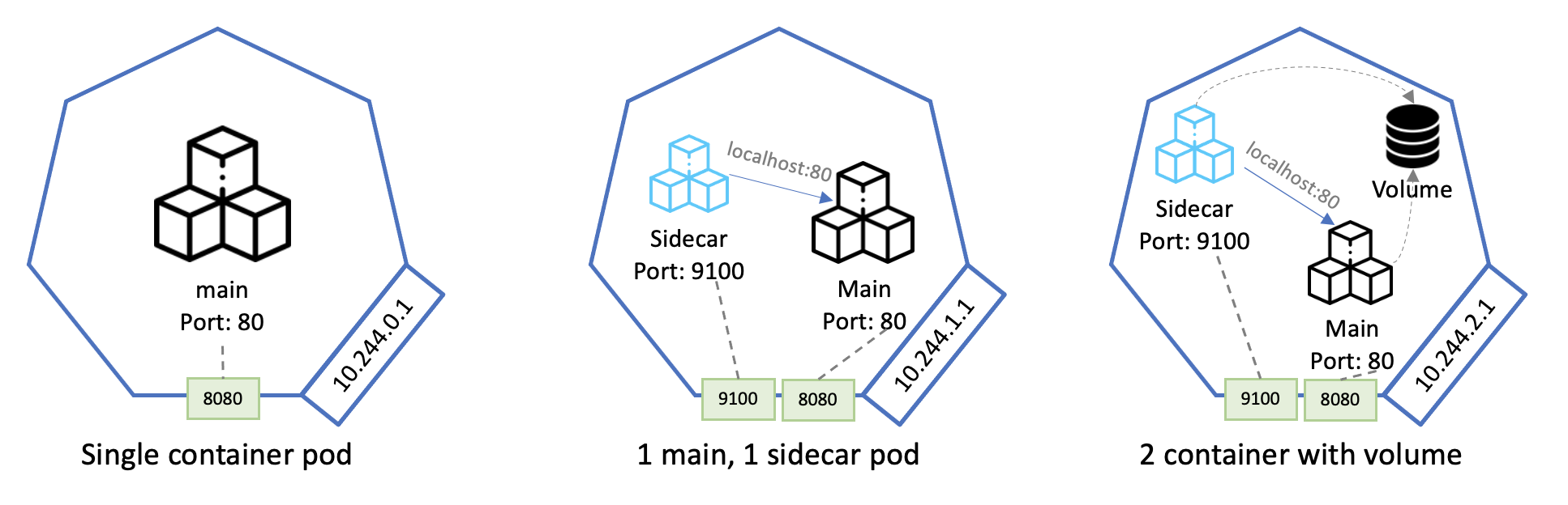 파드는 대표적으로 (1). 하나의 컨테이너 애플리케이션만 단독으로 띄우거나, (2) 하나의 메인 애플리케이션과 사이드카를 같은 파드에 띄우거나, (3) 하나 이상의 컨테이너와 컨테이너끼리 공유하는 볼륨까지 같이 띄운다. 그림으로 보면 다음과 같다.