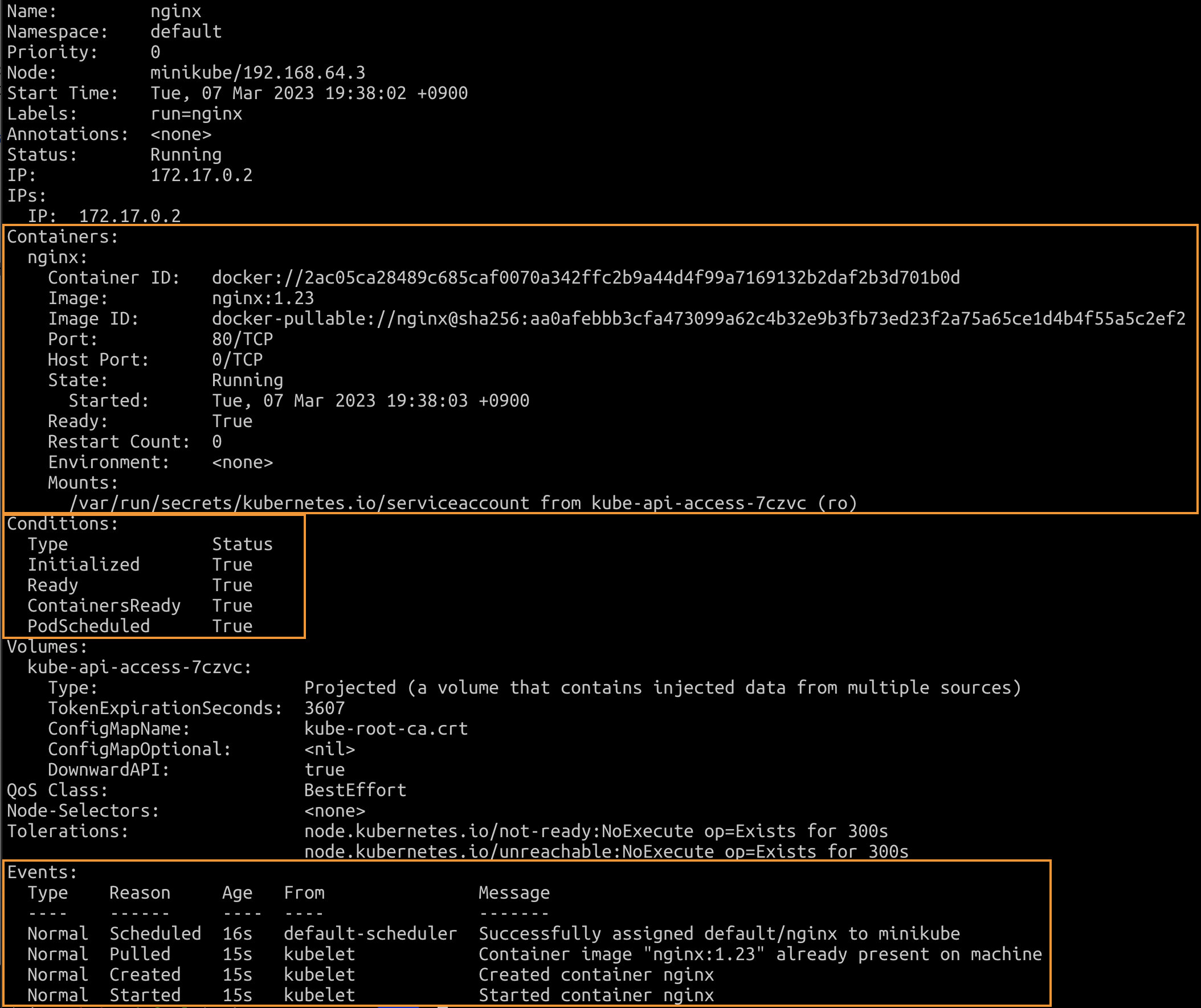 먼저 Containers 부분에서 어떤 이미지를 사용하여 컨테이너를 띄웠고, 해당 컨테이너가 어떤 포트를 사용하는지 등을 알 수 있다. 그리고 Condition 부분에서는 파드가 (특정 노드로) 스케줄링 되었는지, 컨테이너와 파드가 Ready 상태에 있는지 등을 알 수 있다. 그리고 Events 에서는 파드가 구동되는 중에 어떤 과정이 있었는지 확인할 수 있다. Events는 특히 디버깅 용도로 자주 확인하게 될 것이다.